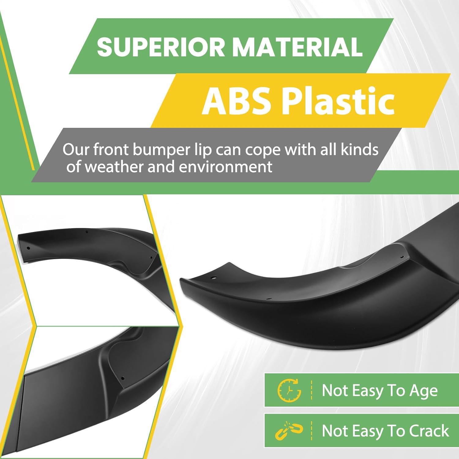 | Included Components | 3Pcs x black front bumper lips, mounting hardware and instruction |